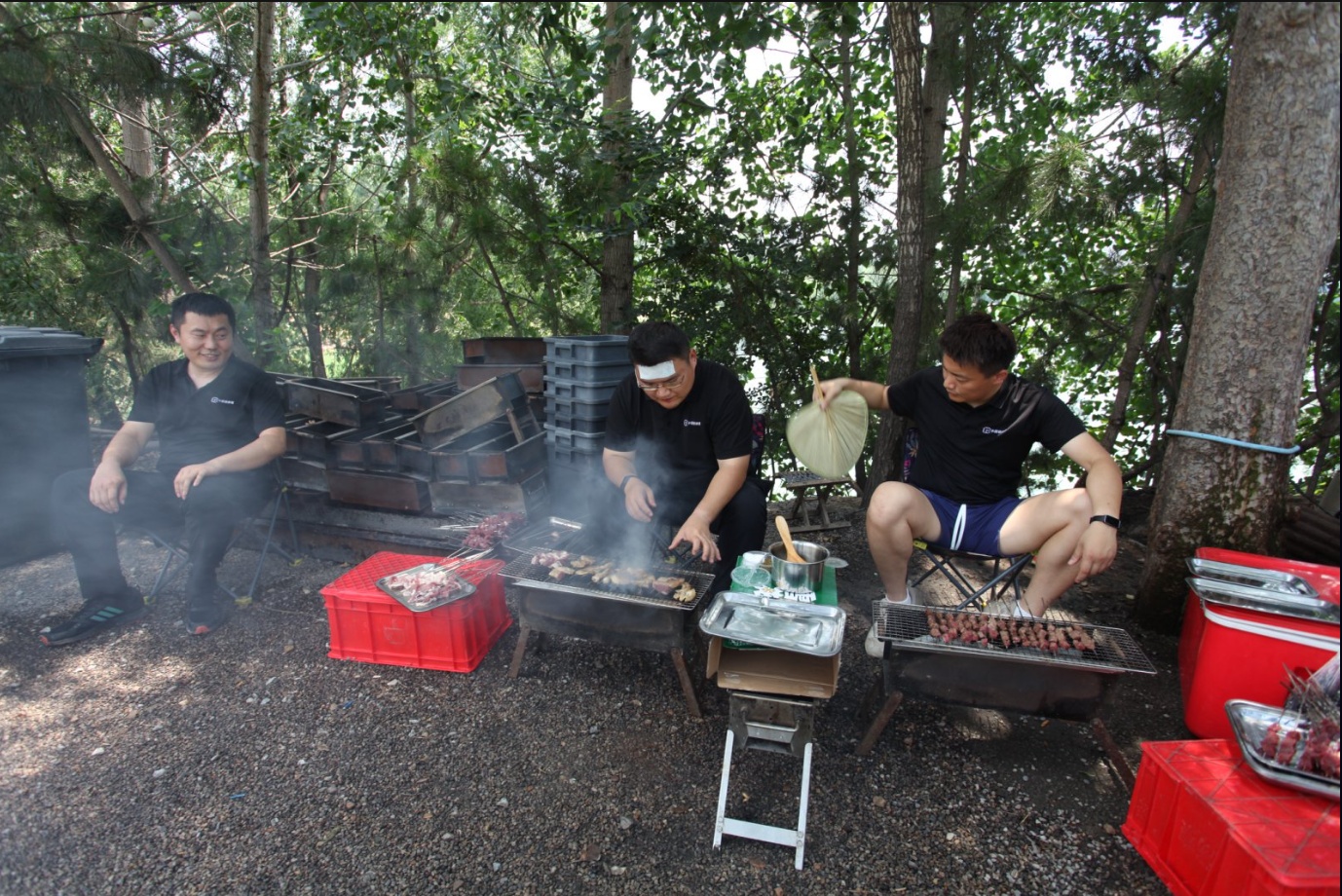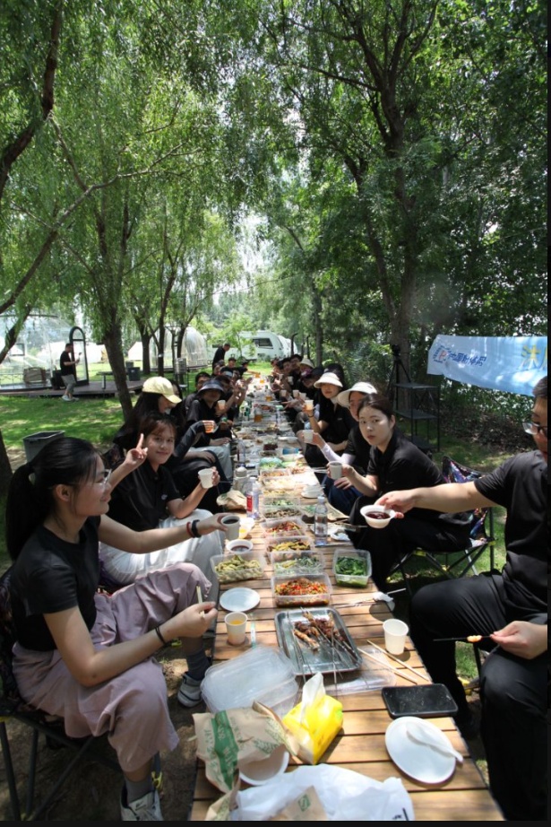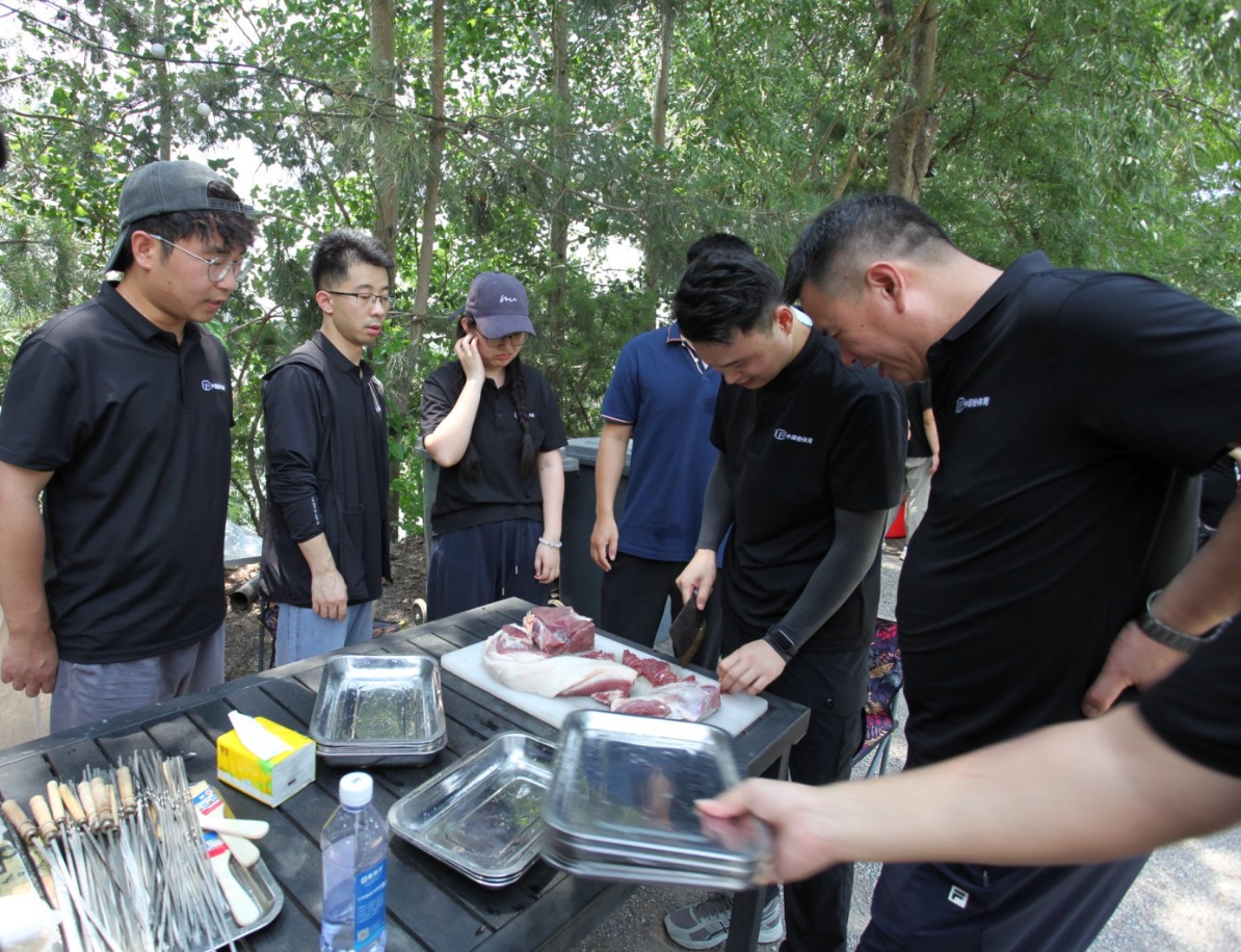 游戲的歡呼余韻未散,眾人便迅速投入燒烤“美食戰(zhàn)場”。大家密切配合,有的熟練地將鮮嫩肉塊切成小塊;有的則化身“串串大師”將肉塊錯落有致地串在竹簽上;經(jīng)驗豐富的“燒烤達(dá)人”則守在烤爐旁,精準(zhǔn)把控火候,適時翻面。炭火噼啪作響,肉串滋滋冒油,歡聲笑語中,陣陣香氣彌漫開來,將團(tuán)建的歡樂氛圍推向新的高潮。