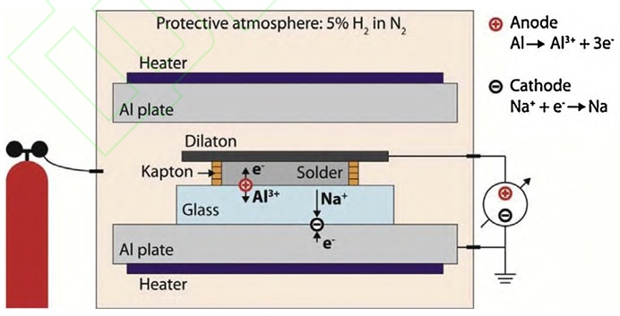 活化液體錫焊料陽極鍵合工藝示意圖 來源:Wim.Optimized solder alloy for glass-to-metal joints by simultaneous soldering and anodic bonding