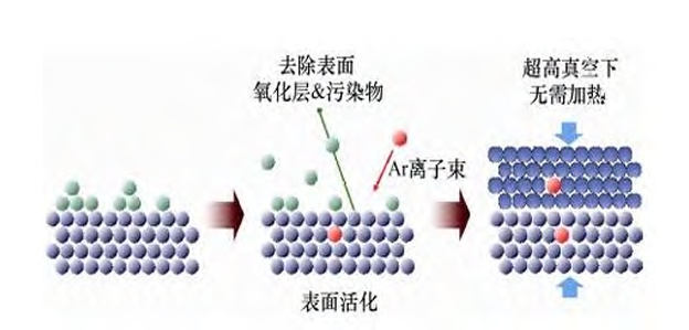 超高真空表面活化室溫鍵合:為消除傳統(tǒng)熱鍵合工藝中熱應(yīng)力引發(fā)的界面失穩(wěn)效應(yīng),研究者開發(fā)出基于超高真空表面活化改性的室溫鍵合技術(shù)。該技術(shù)通過高能離子束轟擊鍵合表面,實(shí)現(xiàn)污染物剝離與氧化層刻蝕,同時(shí)誘導(dǎo)表層原子化學(xué)態(tài)重構(gòu),暴露出高活性亞穩(wěn)態(tài)原子層,進(jìn)而在室溫條件下通過物理接觸即可形成高強(qiáng)度化學(xué)鍵合。