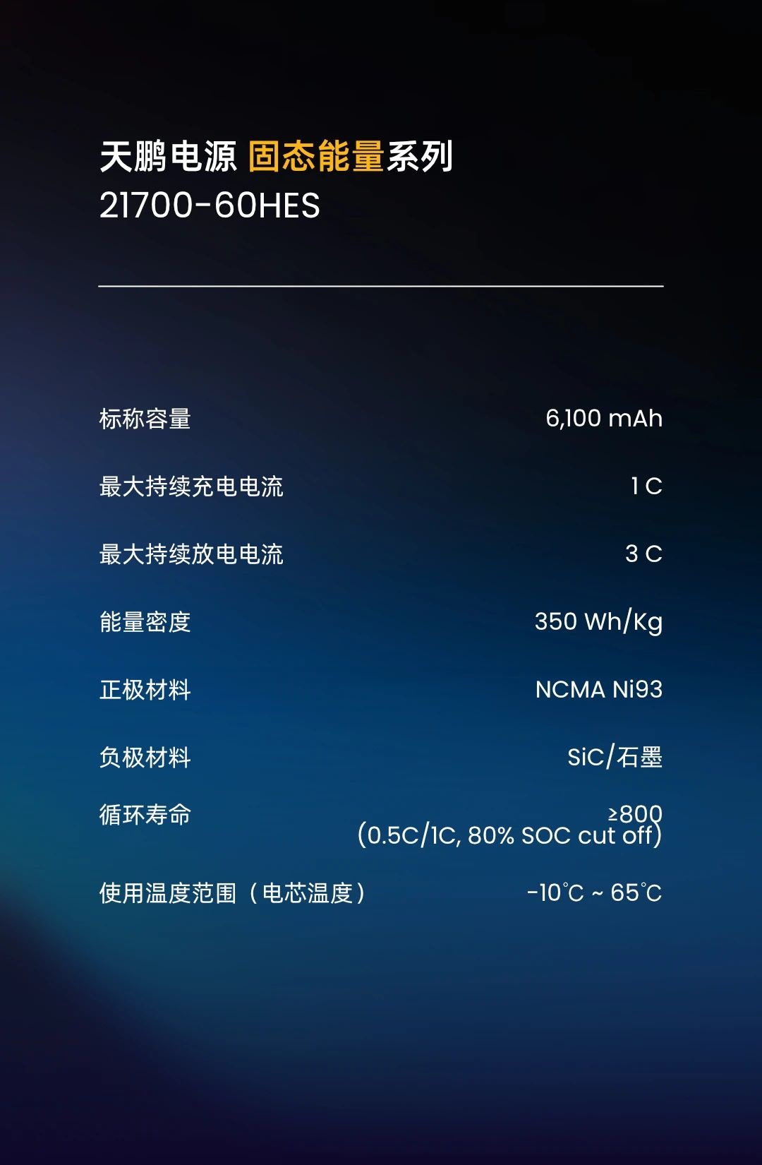 中國粉體網訊 7月6日,江蘇天鵬電源有限公司(簡稱:天鵬電源)宣布,60HES體系電芯突破350Wh/Kg大關,公司全球首款可量產350Wh/Kg級固態圓柱電池出世。