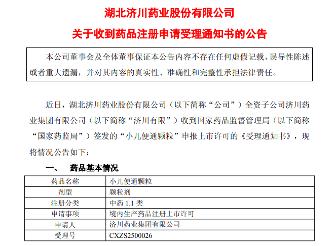 中國粉體網訊 7月8日,湖北濟川藥業發布公告,其全資子公司濟川藥業集團有限公司,收到國家藥品監督管理局簽發的1.1類中藥創新藥小兒便通顆粒申報上市許可的《受理通知書》(CXZS2500026)。