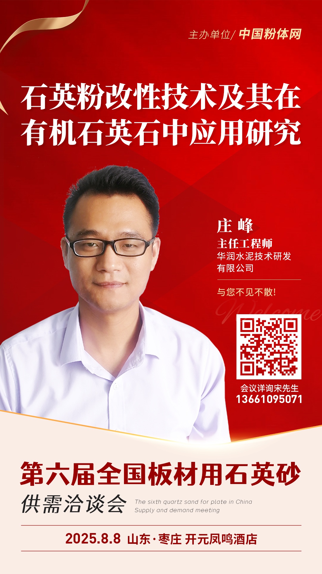 石英粉改性還有哪些優勢及應用?2025年8月8日,由中國粉體網主辦的第六屆全國板材用石英砂供需洽談會將在山東棗莊召開,屆時,華潤水泥技術研發有限公司主任工程師莊峰將做《石英粉改性技術及其在有機石英石中應用研究》的報告,深入解讀石英粉改性在提升有機石英石性能、降低樹脂用量及生產成本等方面的顯著優勢。