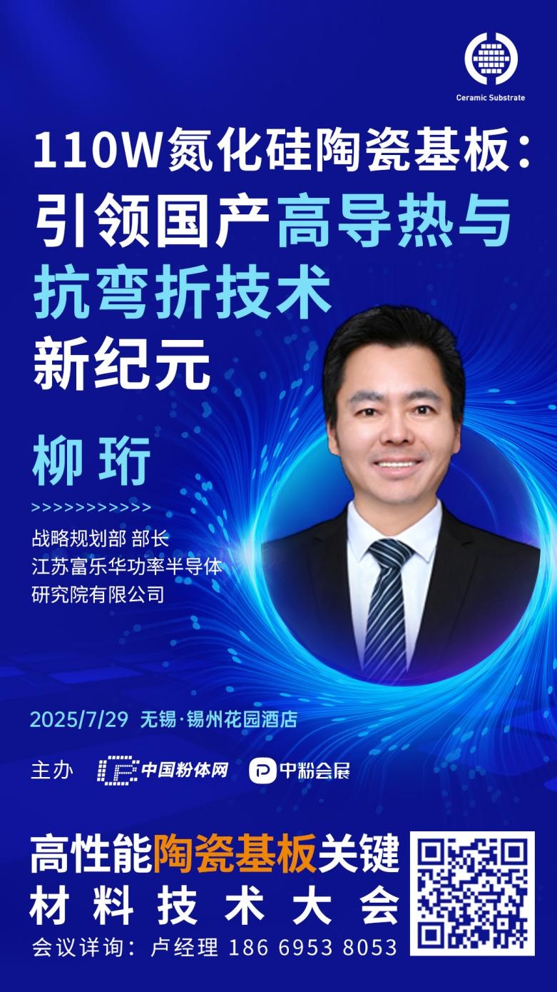 半導體及電子信息產業的快速發展對核心材料的性能提出了更高要求。陶瓷基板作為功率半導體器件的關鍵封裝材料,其導熱性能、機械強度、可靠性和精密程度直接決定了終端產品的性能與壽命。針對材料研發、制備工藝、檢測技術、應用場景等核心議題,中國粉體網將于2025年7月29日在江蘇無錫舉辦2025高性能陶瓷基板關鍵材料技術大會。屆時,江蘇富樂華功率半導體研究院有限公司戰略規劃部部長柳珩將作題為《110W氮化硅陶瓷基板:引領國產高導熱與抗彎折技術新紀元》的報告,報告中就110W氮化硅陶瓷基板的優異性能及廣泛應用進行介紹。