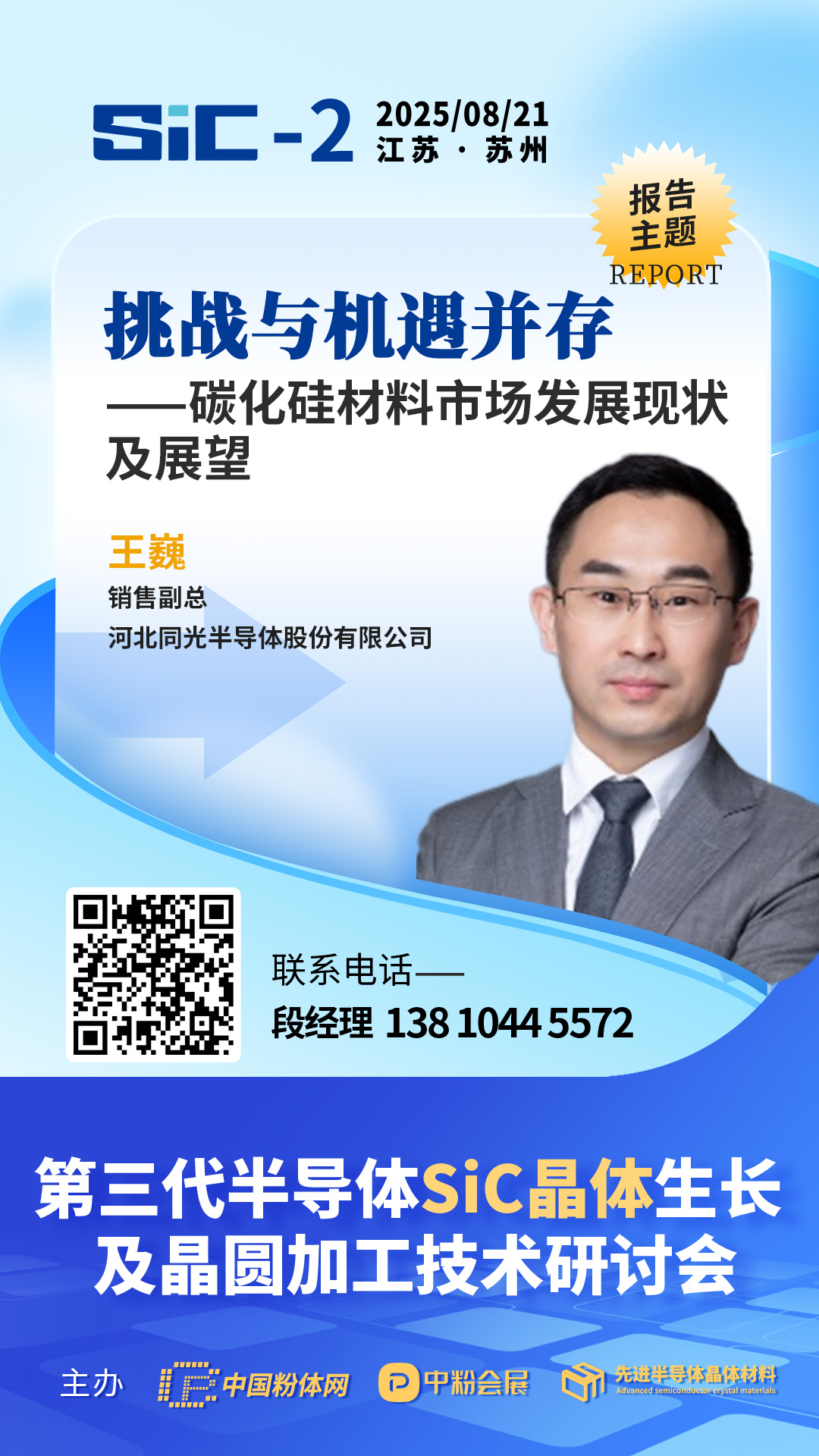 未來,SiC襯底行業發展方向該指向何方?2025年8月21日,中國粉體網將在蘇州舉辦第三代半導體SiC晶體生長及晶圓加工技術研討會。屆時,來自河北同光半導體股份有限公司銷售副總王巍將帶來題為《挑戰與機遇并存 ——碳化硅材料市場發展現狀及展望》的報告,報告將評估當前SiC襯底市場的競爭格局,以及未來幾年內可能影響行業發展的關鍵因素。將提出對SiC襯底產業化進程的展望。