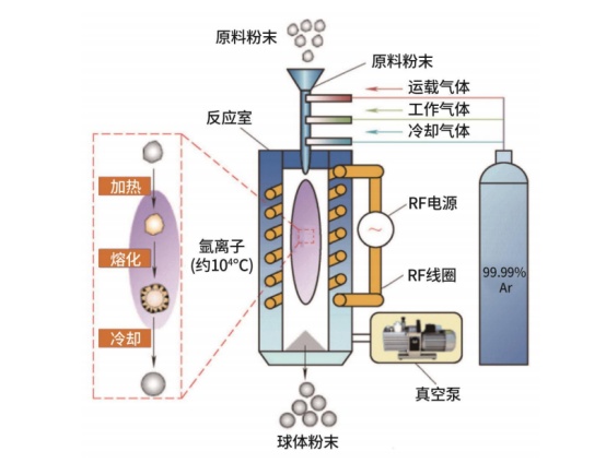 射頻等離子體球化是利用直流電弧或射頻等離子體為熱源對氣體進(jìn)行加熱,通過載氣送粉裝置將原料粉末送入到高溫等離子區(qū)域中吸熱熔融,在表面張力作用下形成球形液滴,隨后液滴經(jīng)過極大的溫度梯度冷卻凝固成粉末的技術(shù)。