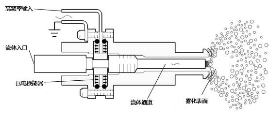 超聲振動(dòng)霧化技術(shù)通過功率源發(fā)生器將工頻交流電轉(zhuǎn)變?yōu)楦哳l電磁振蕩,提供給超聲換能器,超聲換能器借助壓電晶體的伸縮效應(yīng)將高頻電磁振蕩轉(zhuǎn)化為微弱的機(jī)械振動(dòng),然后再將機(jī)械振動(dòng)的質(zhì)點(diǎn)位移或者將機(jī)械振動(dòng)的速度放大,再傳給超聲工具頭,最終通過超聲的高速脈動(dòng)氣流擊破金屬液流,將金屬液滴霧化成不同粒度的液滴。