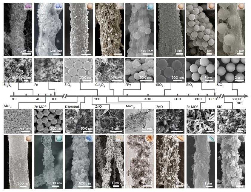研究發現,自收縮力促使承載著粉末顆粒的纖維素片發生皺縮并卷曲成纖維,這種溫和的拓撲變形可避免粉末顆粒的團聚和原始納米精細結構的損傷。該工作成功地將包括單質、化合物、有機物和混合物等各類微納粉末轉變為120余種均勻的微/納米纖維,體現出這種粉末纖維化成型技術強大的普適性和優異的無損性。