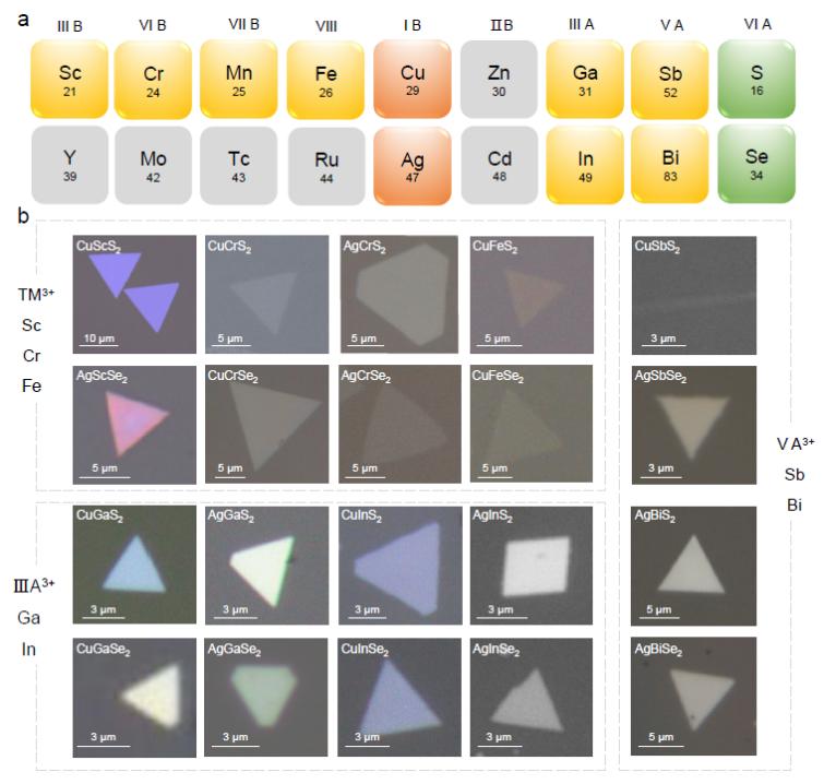 由于AMX2化合物成分、物相復雜,使得多種前驅體供給過程中容易發生預反應從而生成二元相,阻礙三元物相的穩定合成。本研究中通過分離供源的氣相沉積法抑制副反應,實現了20中二維AMX2的可控合成,其中有18種二維材料此前未被合成過。