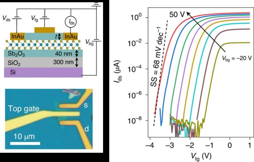 對比實驗中,單層MoS2場效應晶體管的遷移率從遷移率從26提高到了145cm2V-1s-1,轉移特性曲線的回滯則減小了一個數量級。蒸鍍的Sb2O3分子在二維材料表面可形成超薄的致密薄膜,將其作為MoS2場效應晶體管的頂柵介電層,可大幅提高柵極電容,晶體管展現出優異的柵控性能,晶體管的操作電壓和功耗都得到明顯降低,為二維材料應用于低功耗電子器件打下了基礎。