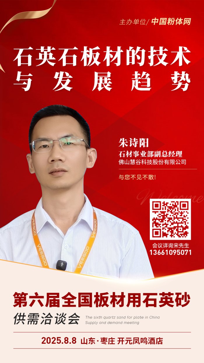 2025年8月8日,由中國粉體網主辦的第六屆全國板材用石英砂供需洽談會將在山東棗莊召開,佛山慧谷科技股份有限公司石材事業部副總經理朱詩陽將做《石英石板材的技術與發展趨勢》的報告,圍繞行業痛點深入解析未來技術方向,誠邀行業同仁共探發展新機。