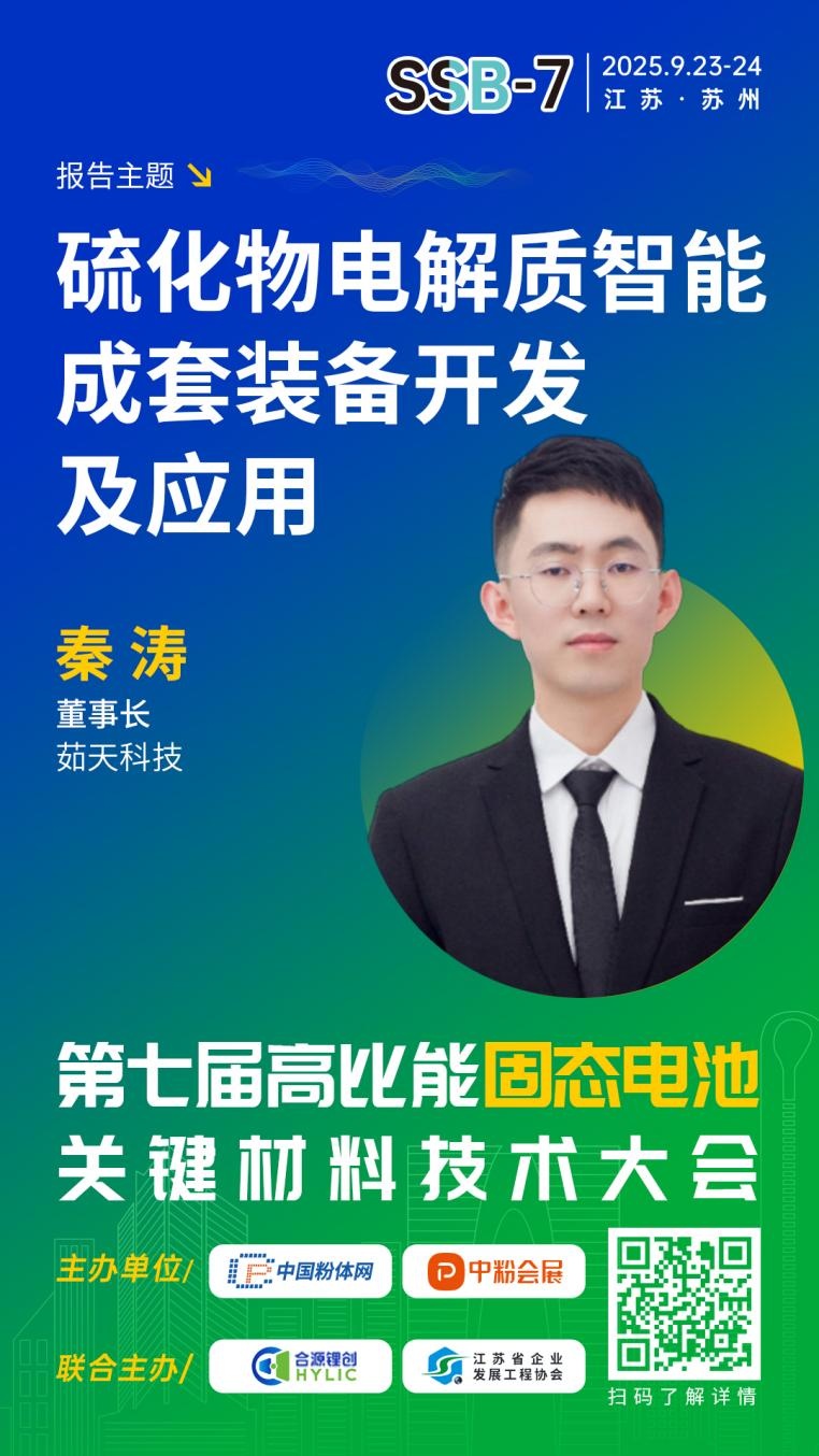 中國粉體網(wǎng)聯(lián)合合源鋰創(chuàng)、江蘇省企業(yè)發(fā)展工程協(xié)會(huì),將于2025年9月23-24日在蘇州舉辦第七屆高比能固態(tài)電池關(guān)鍵材料技術(shù)大會(huì)。本次大會(huì)將聚焦固態(tài)電解質(zhì)、正負(fù)極材料、界面工程、智能制造及產(chǎn)業(yè)化進(jìn)展等熱點(diǎn)議題,深入探討固態(tài)電池的未來發(fā)展趨勢及挑戰(zhàn)。為致力于固態(tài)電池技術(shù)開發(fā)的企業(yè),科研院校,以及新能源汽車、儲(chǔ)能、消費(fèi)電子等終端企業(yè)提供信息交流的平臺(tái),開展產(chǎn)、學(xué)、研合作,助推固態(tài)電池產(chǎn)業(yè)化。屆時(shí),廣東茹天機(jī)械設(shè)備科技有限公司董事長秦濤將作題為《硫化物電解質(zhì)智能成套裝備開發(fā)及應(yīng)用》的報(bào)告。