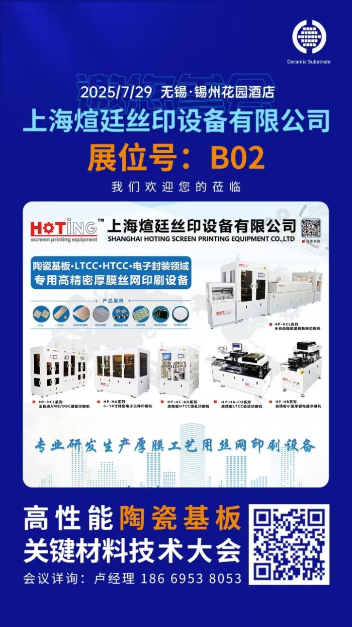 高性能陶瓷基板關鍵材料技術大會將于2025年7月29日在江蘇無錫舉辦。上海煊廷絲印設備有限公司作為參展單位邀請您共同出席。