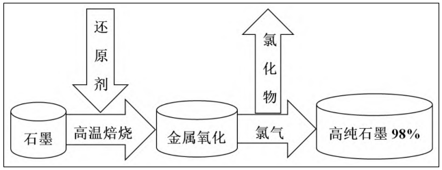氯化焙燒法是將一定量的石墨粉與常用的碳粉還原劑混合后先在特定的氣氛和高溫下進行焙燒,此時,在高溫及還原劑作用下,石墨中的硅酸鹽或鋁硅酸鹽、石英等雜質會分解為簡單的氧化物如Al2O3、Fe2O3、CaO、SiO2、MgO等,隨后再通入氯氣作為氯化劑,此時這些熔沸點較高的氧化物會轉變為熔沸點較低的氯化物或金屬絡合物(其中金屬絡合物主要由熔沸點較高的MgCl2、CaCl2和其他三價金屬氯化物形成)而氣化逸出,從而實現去除石墨中雜質的目的。