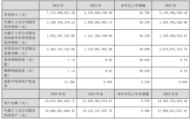 2024年,這家企業的年報不負眾望,報告期內,公司實現營業收入73.75億元,比上年同期增長28.78%;歸屬于母公司所有者的凈利潤21.9億元,比上年同期增長38.55%。報告期內,公司加大研發投入,研發投入金額同比增長6.83%,占公司營業收入比重7.91%。