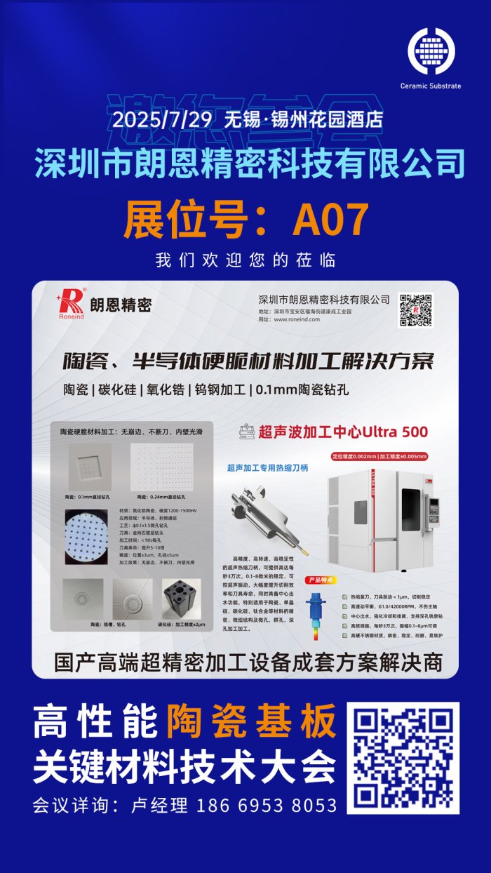 高性能陶瓷基板關鍵材料技術大會將于2025年7月29日在江蘇無錫舉辦。深圳市朗恩精密科技有限公司作為參展單位邀請您共同出席。