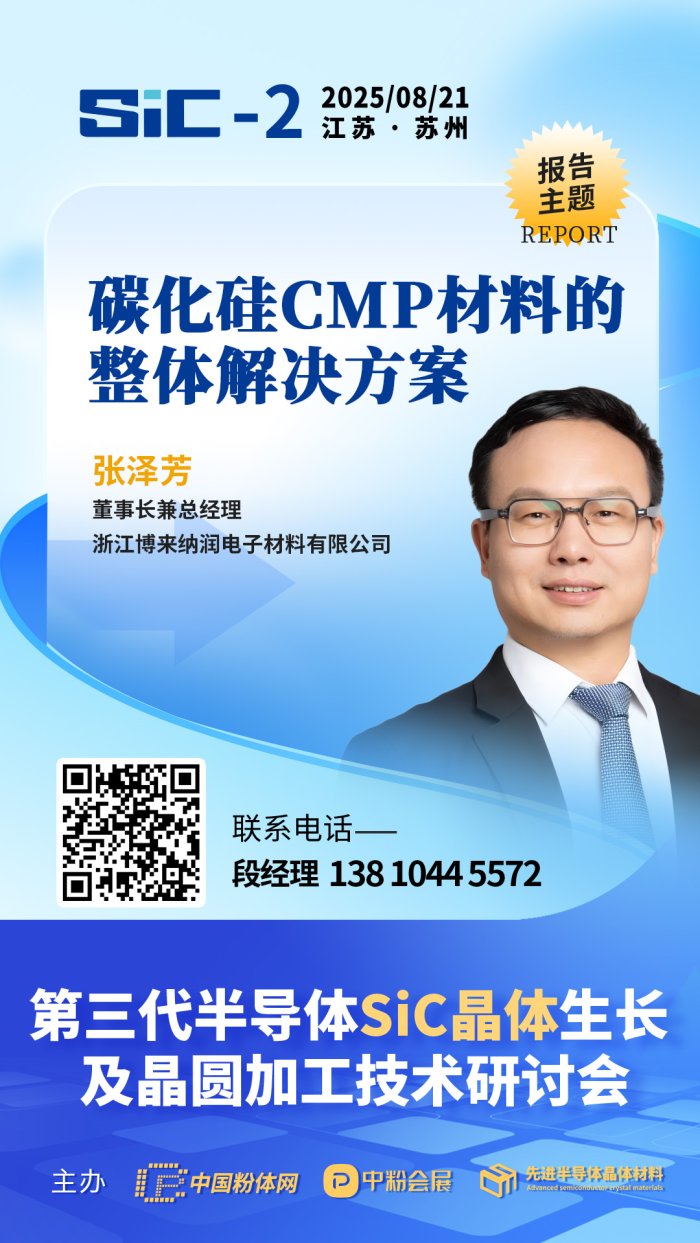 2025年8月21日,中國粉體網將在蘇州舉辦第三代半導體SiC晶體生長及晶圓加工技術研討會。我們邀請到浙江博來納潤電子材料有限公司董事長兼總經理張澤芳并將帶來《碳化硅CMP材料的整體解決方案》的報告。屆時張總將詳細介紹博來納潤針對碳化硅半導體材料所提供的CMP材料整體解決方案,歡迎報名參會!