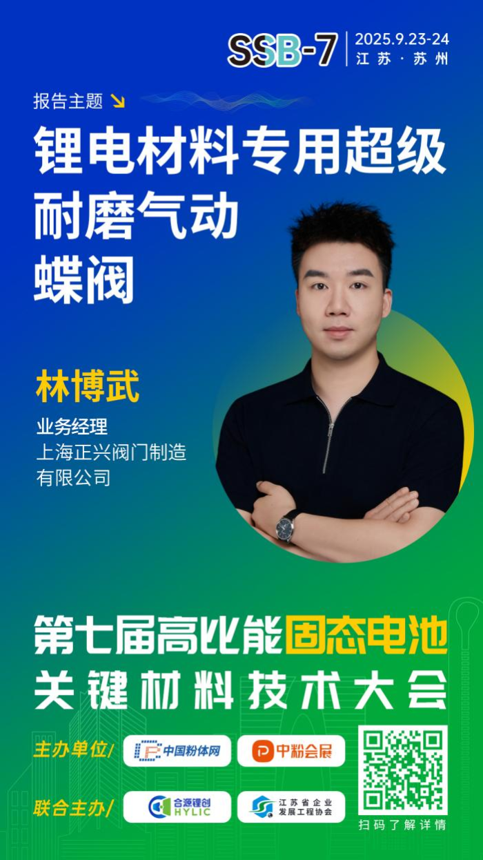 2025年9月23-24日,上海正興閥門(mén)制造有限公司將在中國(guó)粉體網(wǎng)聯(lián)合合源鋰創(chuàng)、江蘇省企業(yè)發(fā)展工程協(xié)會(huì)舉辦的第七屆高比能固態(tài)電池關(guān)鍵材料技術(shù)大會(huì)上進(jìn)行產(chǎn)品展示,并且公司業(yè)務(wù)經(jīng)理林博武將作題為《鋰電材料專用超級(jí)耐磨氣動(dòng)蝶閥》的報(bào)告,歡迎業(yè)界同仁前來(lái)參觀交流。