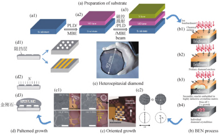 人造金剛石行業主要有高溫高壓法(HTHP)和化學氣相沉積法(CVD)兩種制備方法。其中,CVD法因其耐高壓、大射頻、低成本、耐高溫等優勢,成為制備金剛石半導體襯底的主流方法。理論上講,只要能夠獲得足夠尺寸的襯底,就可以制備出相應尺寸的單晶金剛石。根據襯底種類不同,CVD法沉積金剛石可分為異質外延和同質外延。由于高質量的單晶金剛石襯底很難獲得,因此,選擇一種合適的異質襯底進行外延生長單晶金剛石,無疑是制備英寸級單晶金剛石的最優選擇。