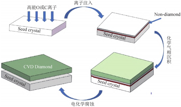 將CVD金剛石層從籽晶上剝離出來,需要利用離子注入技術。使用激光切割方法分離外延層時,會損耗掉一部分的金剛石,且損耗的比例隨著金剛石片的尺寸增加而變大。離子注入技術預先使用高能粒子對襯底進行轟擊,在預先拋光過的金剛石籽晶表面之下約幾百納米處形成非金剛石相,損傷層深度由注入的離子能量決定。經過離子注入的金剛石籽晶繼續利用同質外延技術生長單晶金剛石,隨后利用電化學腐蝕技術將非金剛石相去除,達到分離襯底的目的。