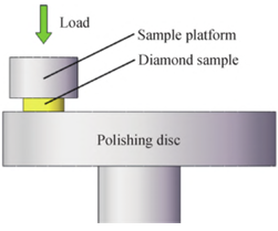 機械拋光(MP):MP是利用金剛石與高速旋轉的拋光盤(鑄鐵盤、砂輪盤)相互摩擦產生脆性斷裂去除表面材料的拋光工藝,同時,由于高速旋轉的拋光盤與金剛石摩擦會產生高溫,而高溫提供了“硬”的金剛石相向“軟”的石墨相轉變的驅動力,通過利用微切削與石墨化相結合的原理實現金剛石的拋光。