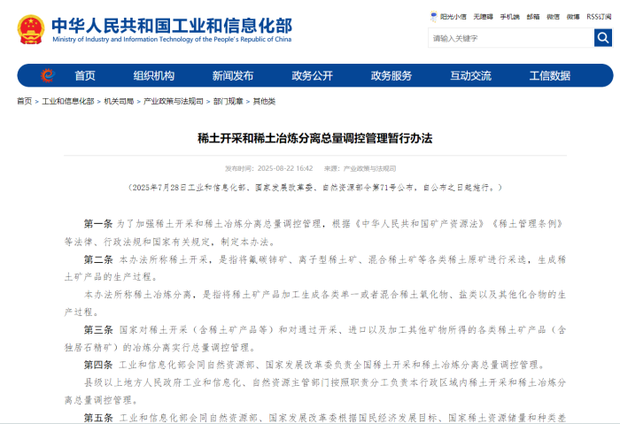 2025年8月22日,工信部、發(fā)改委、自然資源部聯(lián)合發(fā)布《稀土開采和稀土冶煉分離總量調(diào)控管理暫行辦法》,首次明確將進(jìn)口稀土礦納入全國總量控制指標(biāo)管理(此前僅限國內(nèi)礦),徹底切斷中小冶煉廠原料渠道。新規(guī)取消稀土集團(tuán)的指標(biāo)分解權(quán),改為由部委直接下達(dá)指標(biāo)至生產(chǎn)企業(yè),并強(qiáng)制企業(yè)每月10日前上傳稀土產(chǎn)品流向至國家追溯系統(tǒng),違規(guī)企業(yè)將面臨下年度指標(biāo)核減。