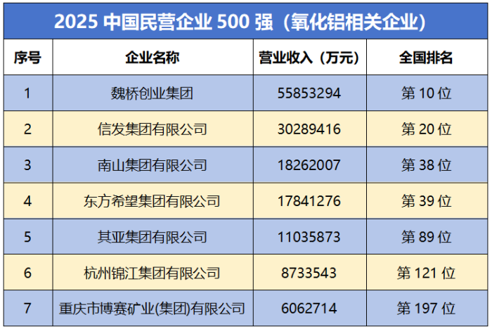 中國粉體網訊 8月28日,全國工商聯在遼寧沈陽發布“2025中國民營企業500強”,據了解,此次民營企業500強入圍門檻增至270.23億元。其中,共有7家氧化鋁企業入圍該榜單。