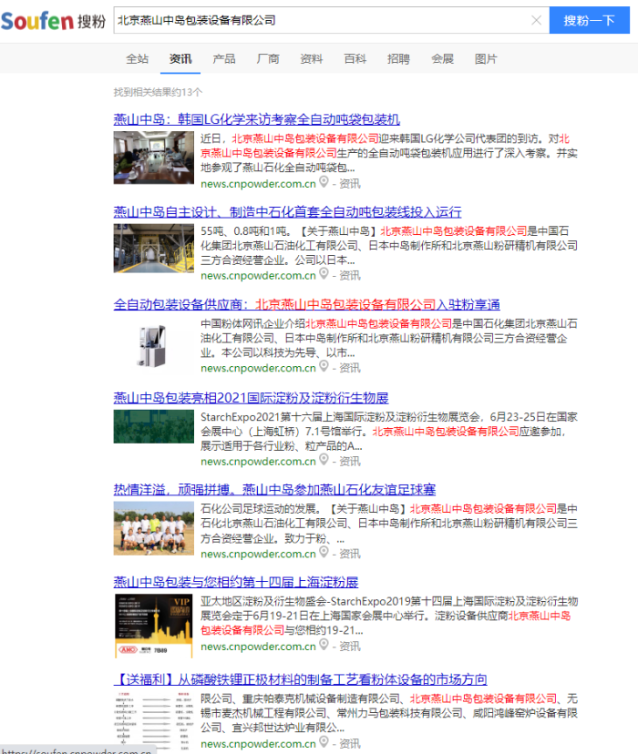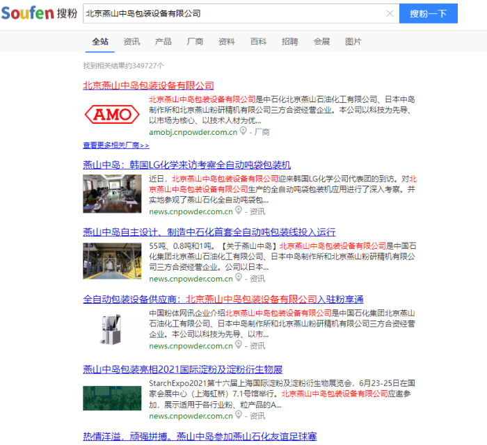 3.專屬品牌形象:依托站內搜索欄目,粉體網會員特設品牌專區,彰顯品牌形象,把握用戶的每一次品牌搜索,高效建立品牌鏈接。粉體網站內,搜索“北京燕山中島包裝設備有限公司”,即可瀏覽公司專屬品牌專區。專屬品牌形象的塑造,進一步提升了公司在客戶心目中的品牌地位,增強了品牌的辨識度和影響力。