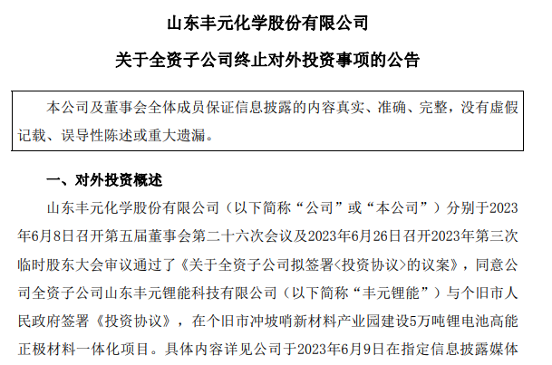 中國粉體網(wǎng)訊 8月30日,山東豐元化學股份有限公司發(fā)布公告,宣布全資子公司山東豐元鋰能科技有限公司將終止在個舊市的對外投資事項。