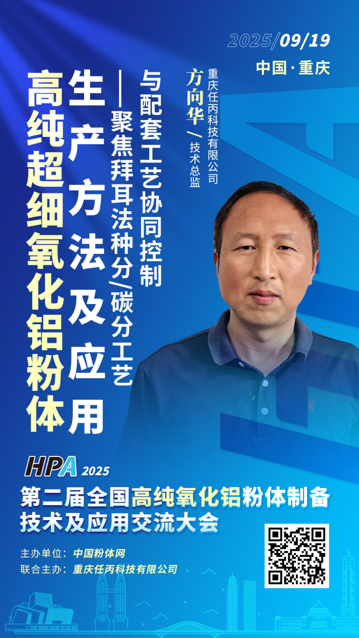 任丙科技作為當前采用改良拜耳法生產高純氧化鋁的代表企業,在該領域擁有寶貴的研發生產經驗。9月19日,中國粉體網聯合任丙科技將在中國·重慶舉辦2025第二屆全國高純氧化鋁粉體制備技術及應用交流大會,屆時,任丙科技技術總監方向華將帶來題為《高純超細氧化鋁粉體生產方法及應用——聚焦拜耳法種分/碳分工藝與配套工藝協同控制》的報告。該報告將聚焦拜耳法生產高純超細氧化鋁的工藝,從種子分解和碳酸化分解兩方向分別介紹粒度及原晶形貌的關鍵參數以及煅燒和研磨等精細控制粒度的方法。