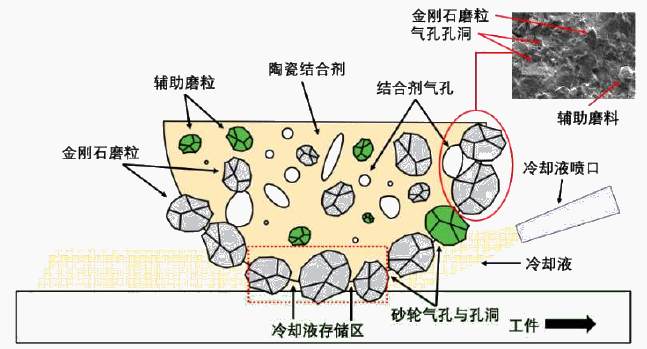陶瓷結(jié)合劑砂輪的主要磨削部分由人造金剛石磨粒、陶瓷結(jié)合劑與氣孔等組成。