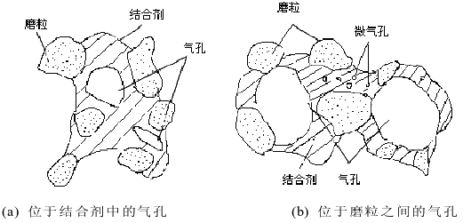 氣孔可以起到容納磨削液、散熱、容納磨屑的作用,避免了磨削溫度過高和磨屑不易排出的問題。氣孔在陶瓷結(jié)合劑金剛石砂輪中的分布形式有兩種,一是氣孔分布于磨粒之間的結(jié)合劑橋中,這種氣孔在磨削過程中起到有利的作用;二是氣孔位于磨粒之間,致使磨粒在磨削過程中容易脫落,把持力減弱。