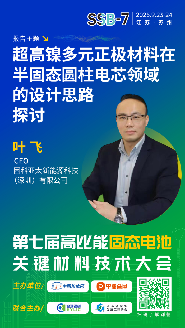 針對固態電池產業化發展現狀,中國粉體網聯合合源鋰創、江蘇省企業發展工程協會將于2025年9月23-24日在江蘇· 蘇州舉辦第七屆高比能固態電池關鍵材料技術大會。為致力于固態電池技術開發的企業,科研院校,以及新能源汽車、儲能、消費電子等終端企業提供信息交流的平臺,開展產、學、研合作。屆時,來自固科亞太新能源科技(深圳)有限公司的CEO葉飛將作題為《超高鎳多元正極材料在半固態圓柱電芯領域的設計思路探討》的報告。