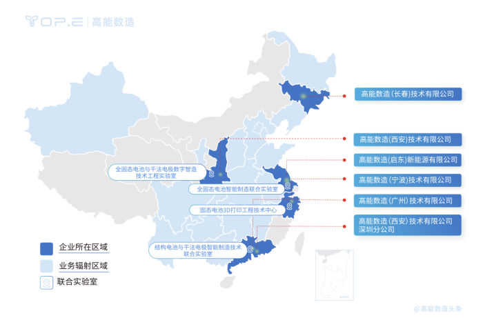 自 2021 年成立起,高能數(shù)造以 “研發(fā) + 產(chǎn)業(yè)化” 雙線并行戰(zhàn)略,構(gòu)建全國(guó)協(xié)同網(wǎng)絡(luò):西安為核心研發(fā)策源地,持續(xù)輸出前沿技術(shù);長(zhǎng)春、寧波、啟東分別在服務(wù)主機(jī)廠、新材料驗(yàn)證、設(shè)備制造環(huán)節(jié)筑牢產(chǎn)業(yè)支撐,形成覆蓋研發(fā)、生產(chǎn)、制造的全鏈條能力。2025年9 月,廣州第二總部建成與首條干法電極中試線落地,成為高能數(shù)造發(fā)展的雙里程碑。