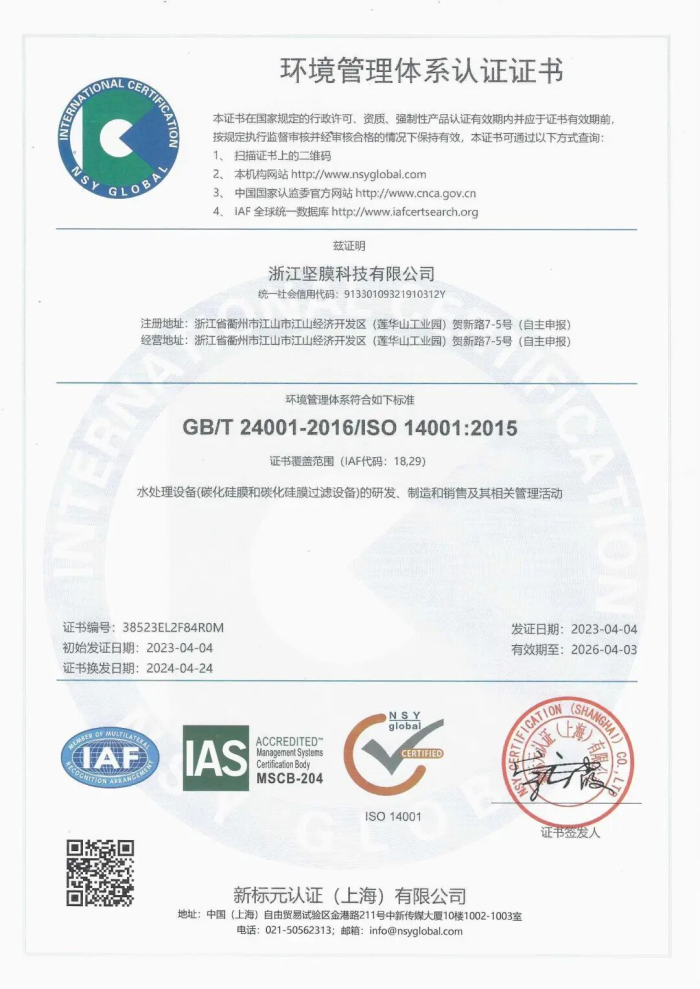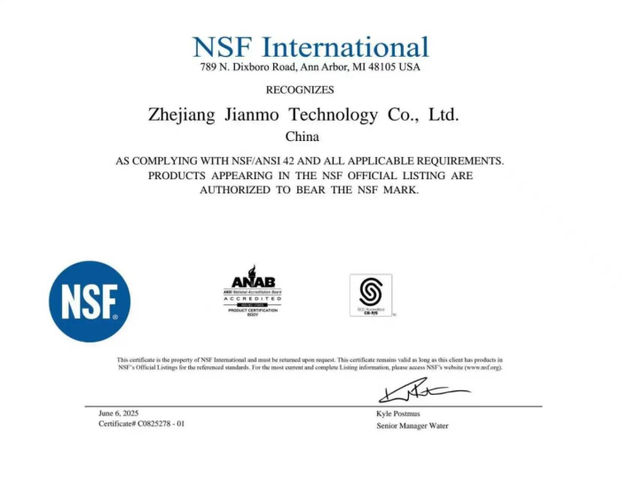 除NSF認證與涉水批件外,浙江堅膜科技有限公司還擁有ISO9001質量管理體系認證、ISO14001環境管理體系認證、ISO45001職業健康安全管理體系認證、五星級售后認證等,從生產管理、質量控制到服務流程,均實現標準化、規范化運作。