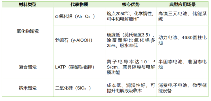 電池系統作為新能源汽車的“心臟”,其安全性與性能對整車至關重要。陶瓷隔膜能有效防止鋰離子電池在高溫環境下發生內部短路,維持電池系統的結構完整性。隨著電池能量密度不斷提升,傳統聚合物隔膜已難以滿足高安全性要求,α-氧化鋁、勃姆石等陶瓷材料因其低熱導率、高溫穩定性以及優異的離子通透性成為理想的隔膜材料。目前,隨著制備工藝日益成熟以及市場對勃姆石的日益認可,勃姆石在無機涂覆材料應用中的占比逐漸提升,氧化鋁的市場空間正在被逐漸壓縮。此外,含陶瓷涂層的復合隔膜可顯著提高電池的耐熱溫度,改善了電池的安全性能。