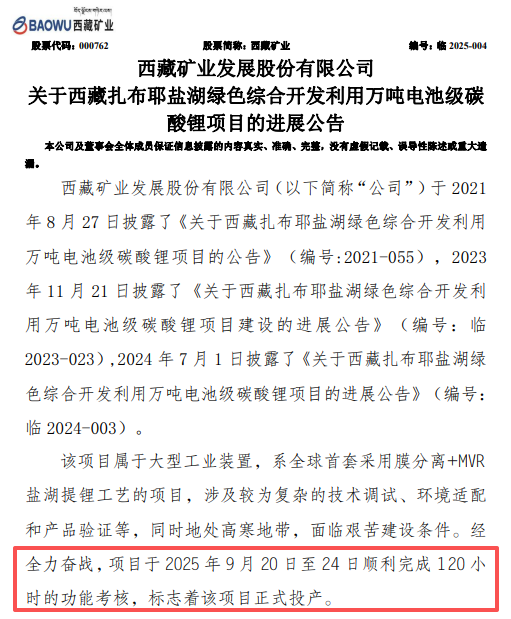 中國粉體網訊 9月26日,西藏礦業發布公告,其西藏扎布耶鹽湖綠色綜合開發利用萬噸電池級碳酸鋰項目于2025年9月20日至24日順利完成120小時的功能考核,標志著該項目正式投產。該項目屬于大型工業裝置,系全球首套采用膜分離+MVR鹽湖提鋰工藝的項目,涉及較為復雜的技術調試、環境適配和產品驗證等。
