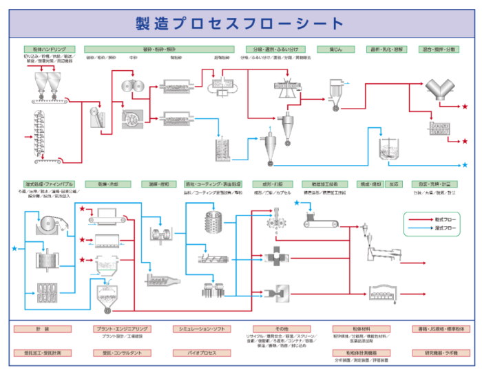 按照“從原料開始制備粉體→從生成的粉體中篩選或回收所需粉體→調整其使用條件→將其轉化為新的顆粒形態→最終進行儲存”的邏輯順序,典型的粉體加工流程如下: