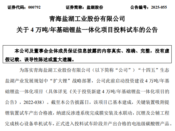 中國粉體網訊 9月29日,鹽湖股份發布公告稱,公司此前啟動投資建設4萬噸/年基礎鋰鹽一體化項目已基本建成,關鍵裝置吸附提鋰裝置試車產出合格液,納濾反滲透系統完成膜安裝及水聯動,沉鋰及公輔工程完成核心設備單機試車,正式進入投料試車階段并產出合格的電池級碳酸鋰產品。