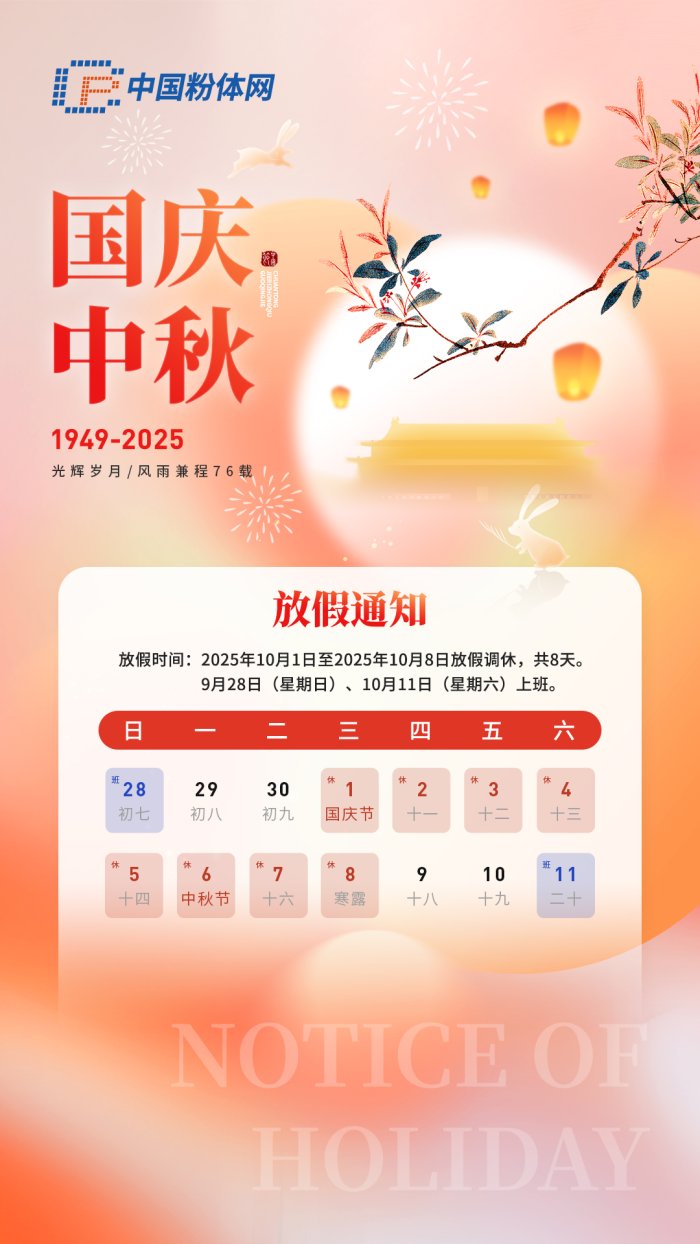 秋風送爽,丹桂飄香。值此國慶佳節與中秋團圓之際,中國粉體網全體員工向您致以最誠摯的祝福,感謝您長期以來對我們的信任與支持!