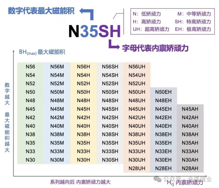主稱代號由釹(Nd)、鐵(Fe)、硼(B)元素的化學符號組成,代表材料的基礎成分。數字部分表示最大磁能積(BH)max的標稱值,數字越大表明磁能積越高,例如N48比N35具有更強的磁能。字母后綴表示內稟矯頑力HcJ的分級,從低到高依次為:N(普通)、M(中等)、H(高)、SH(特高)、UH(超高)、EH(極高)和AH(特高)。