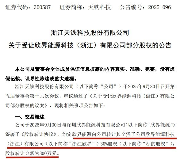 據(jù)公告消息,2025年9月30日,天鐵科技與欣界能源簽署了《股權(quán)轉(zhuǎn)讓協(xié)議》,約定欣界能源向天鐵科技轉(zhuǎn)讓其全資子公司浙江欣界30%股權(quán),股權(quán)轉(zhuǎn)讓金額為300萬元。