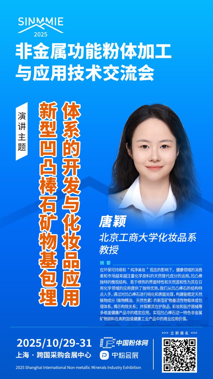 有業(yè)內(nèi)人士指出,在化妝品領(lǐng)域,凹凸棒石正在從傳統(tǒng)的吸附劑、增稠劑,向高性能防曬載體、活性物緩釋平臺(tái)和智能護(hù)膚系統(tǒng)等高附加值方向轉(zhuǎn)變,發(fā)展?jié)摿Σ粩噌尫拧?/span>10月29-31日,北京粉體技術(shù)協(xié)會(huì)、柏德英思展覽(上海)有限公司、山東中粉會(huì)展服務(wù)有限公司將在上?鐕(guó)采購(gòu)會(huì)展中心聯(lián)合主辦“上海國(guó)際非金屬礦工業(yè)展覽會(huì)(SINMMIE2025)”,展會(huì)現(xiàn)場(chǎng)將同期舉辦“非金屬功能粉體加工與應(yīng)用技術(shù)交流會(huì)”,屆時(shí)將邀請(qǐng)北京工商大學(xué)唐穎教授作《新型凹凸棒石礦物基包埋體系的開(kāi)發(fā)與化妝品應(yīng)用》專題報(bào)告,分享凹凸棒石純化和表面處理技術(shù),新型礦物基活性物載體或包埋體系構(gòu)建和應(yīng)用技術(shù),并探索其在護(hù)膚品、彩妝和醫(yī)療器械等多維度健康產(chǎn)品中的穩(wěn)定應(yīng)用等內(nèi)容。