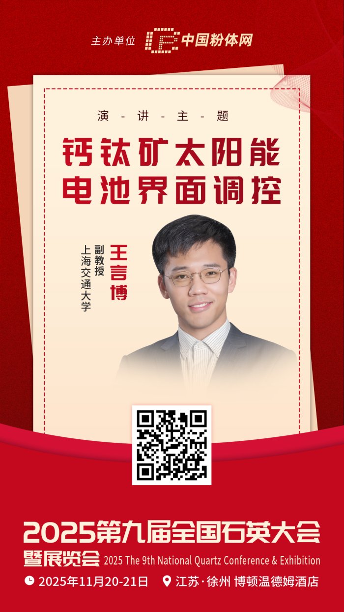2025年11月20-21日,中國粉體網(wǎng)將在江蘇徐州舉辦“2025(第九屆)全國石英大會暨展覽會”。屆時,上海交通大學(xué)副教授王言博將帶來題為《鈣鈦礦太陽能電池界面調(diào)控》的報告,為相關(guān)領(lǐng)域研究提供交流與參考。