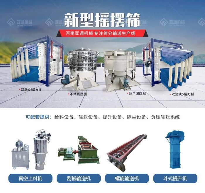 河南亞通機械設備有限公司位于 “振動之都”新鄉,是一家生產銷售振動篩、提升設備、輸送設備的骨干企業。主營: 精細篩分 (方形搖擺篩、圓形搖擺篩、直線振動篩、旋振篩、超聲波振動篩、檢驗篩、直排篩、氣流篩) ,礦用篩分 (脫水篩、概率篩、張弛篩) ,給料設備 (振動料斗、振動給料機、星型卸料器、電磁給料機) ,輸送設備 (刮板輸送機、螺旋輸送機、真空上料機、斗式提升機、無塵投料站) ,除塵設備以及常用備件等。