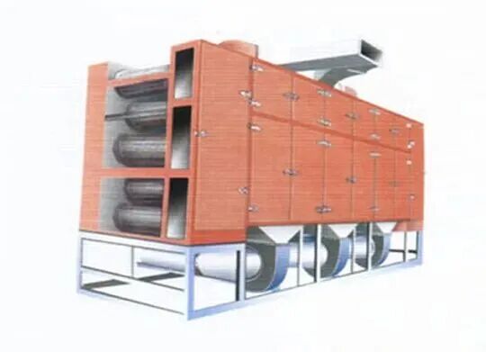帶式干燥機輸送帶上分布著星型布料器、擺動帶、粉碎機或造粒機,輸送帶通過一個或幾個加熱單元組成的通道,每個加熱單元均配有空氣加熱和循環系統,每一個通道有一個或幾個排濕系統,在輸送帶通過時,熱空氣從上往下或從下柱上通過輸送帶上的物料,從而使物料能均勻干燥。