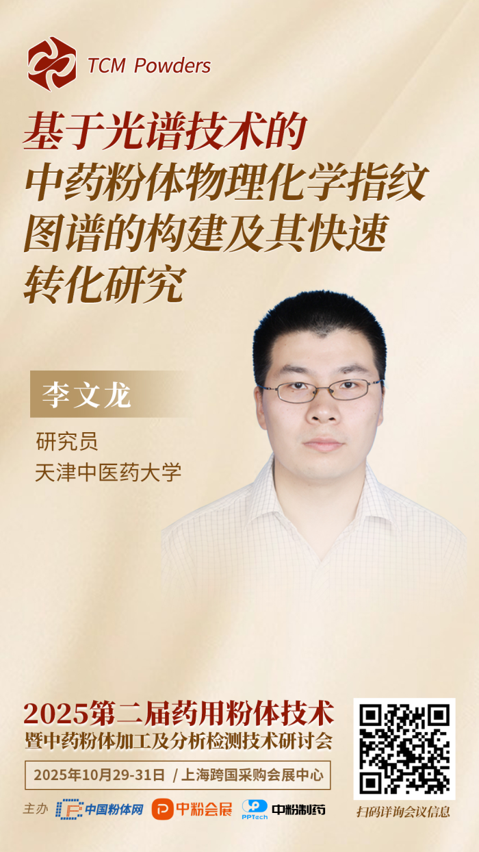 聚焦“從粉體技術、論中藥工藝”為主題,10月29-31日,中國粉體網將于2025IPIE上海高端粉體裝備與科學儀器展覽會期間,同期舉辦“2025第二屆藥用粉體技術暨中藥粉體加工及分析檢測技術研討會”,屆時天津中醫藥大學研究員李文龍將為大家帶來《基于光譜技術的中藥粉體物理化學指紋圖譜的構建及其快速轉化研究》的主題報告。報告主講人將介紹一項基于近紅外(NIR)光譜技術構建中藥粉體物理化學指紋圖譜的研究。研究以多種中藥粉體/顆粒為對象,系統測定其物理性質(如粒徑、流動性、密度、吸濕性等)與化學組成,并結合化學計量學方法,建立NIR光譜與粉體物理化學參數之間的定量轉化模型。成功構建了中藥粉體的物理化學指紋圖譜,驗證了NIR光譜技術在預測粉體關鍵質量屬性中的準確性與穩定性。該研究為中藥粉體質量的在線監測與智能控制提供了技術支撐,具有良好的推廣應用前景。