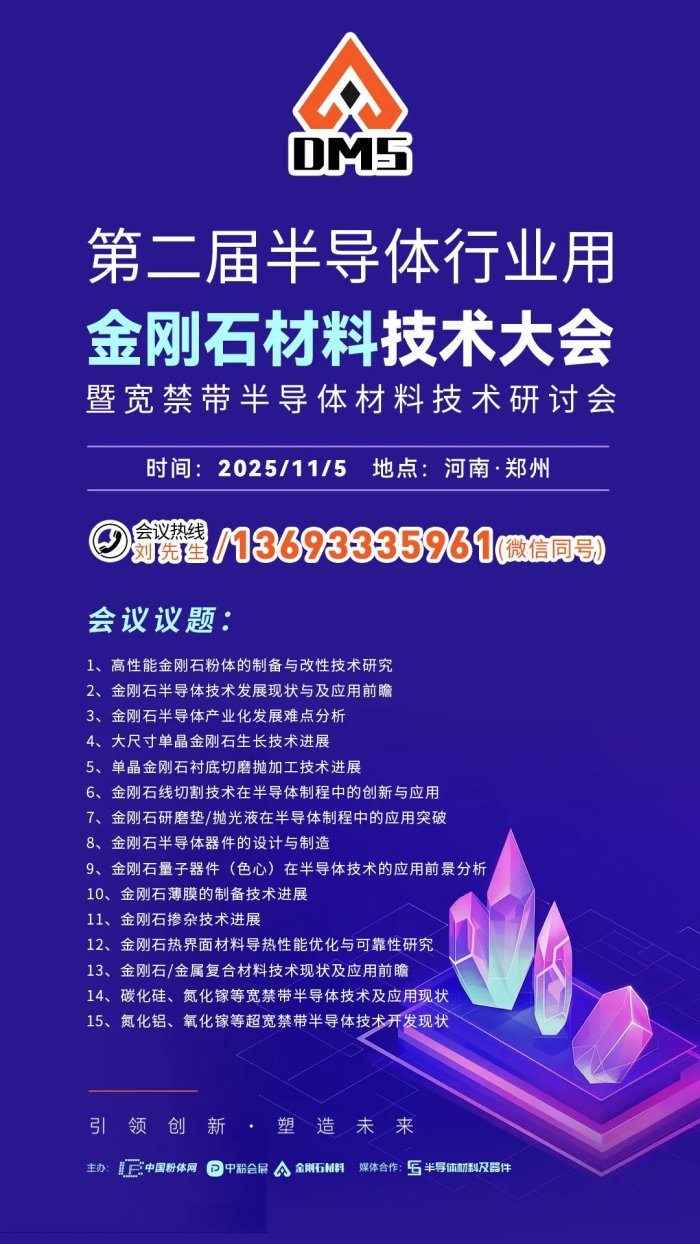 從2025半導體行業(yè)用金剛石材料技術大會組委會獲悉,本屆會議將于2025年11月5日在鄭州舉辦。華為技術有限公司邀請您共同出席。