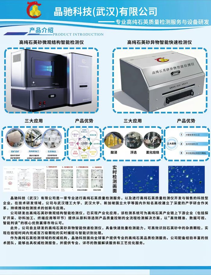 晶馳科技(武漢)有限公司是專注于高純石英質(zhì)量檢測(cè)領(lǐng)域的科技型企業(yè),集檢測(cè)技術(shù)服務(wù)、智能化檢測(cè)儀器研發(fā)與銷售于一體。公司總部坐落于湖北省武漢市洪山區(qū)——這座被譽(yù)為"中國大學(xué)之城"的創(chuàng)新高地,依托區(qū)域豐富的高校人才資源和四通八達(dá)的交通網(wǎng)絡(luò),為企業(yè)發(fā)展注入強(qiáng)勁動(dòng)能。