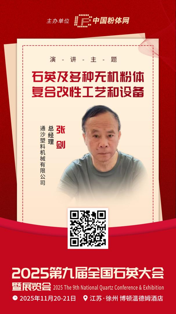 2025年11月20-21日,中國粉體網(wǎng)將在江蘇徐州舉辦“2025(第九屆)全國石英大會暨展覽會”。屆時(shí),通沙塑料機(jī)械有限公司總經(jīng)理張劍,將帶來題為《石英及多種無機(jī)粉體復(fù)合改性工藝及設(shè)備》的報(bào)告。他將用多年實(shí)戰(zhàn)經(jīng)驗(yàn)拆解技術(shù)難點(diǎn),用創(chuàng)新設(shè)備方案破解生產(chǎn)痛點(diǎn),助力行業(yè)同仁共探石英及多種無機(jī)粉體復(fù)合改性高端化發(fā)展新路徑!