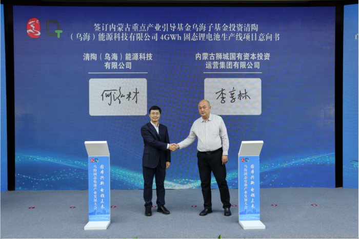 清陶烏海與內蒙古獅城國有資本投資運營集團有限公司簽訂內蒙古重點產業引導基金——烏海子基金投資烏海清陶4GWh固態鋰電池生產線項目意向書,共拓發展新空間。